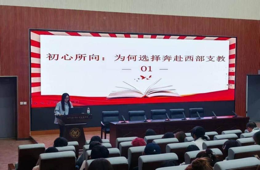 第二十五届研究生支教团成员陶旋以个人成长蜕变为主线,讲述了从支教“新手”到“能独当一面”的成长过程。初到支教地时,他面临教学与环境的双重挑战,而当地老教师的坚守精神与悉心指导让他逐渐掌握了教学技巧,学会了根据学生特点因材施教,成为能够独当一面的老师。“支教是一次自我成长的旅程,去南疆支教,你将收获的不仅仅是教学经验,更是人生的宝贵财富。”他的感悟与鼓励进一步坚定了在场学子投身于西部教育的信念。