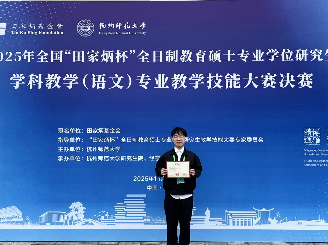 11月9日,由田家炳教育基金会、杭州师范大学及杭州师范大学经亨颐教育学院联合主办的2025年全国“田家炳杯”全日制教育硕士专业学位研究生学科教学(语文)专业技能大赛决赛圆满结束。我校国产色情视频 2024级学科教学(语文)专业研究生蒋前铭,在吴新锋教授的悉心指导下,凭借扎实的教学功底、创新的教学设计及出色的现场表现,从全国128所高校的173名顶尖选手中脱颖而出,荣获国家一等奖,成为新疆(兵团)该赛事首位一等奖得主及首位国省校大满贯得主,实现了我校在学科教学(语文)领域国家级赛事的历史性突破!